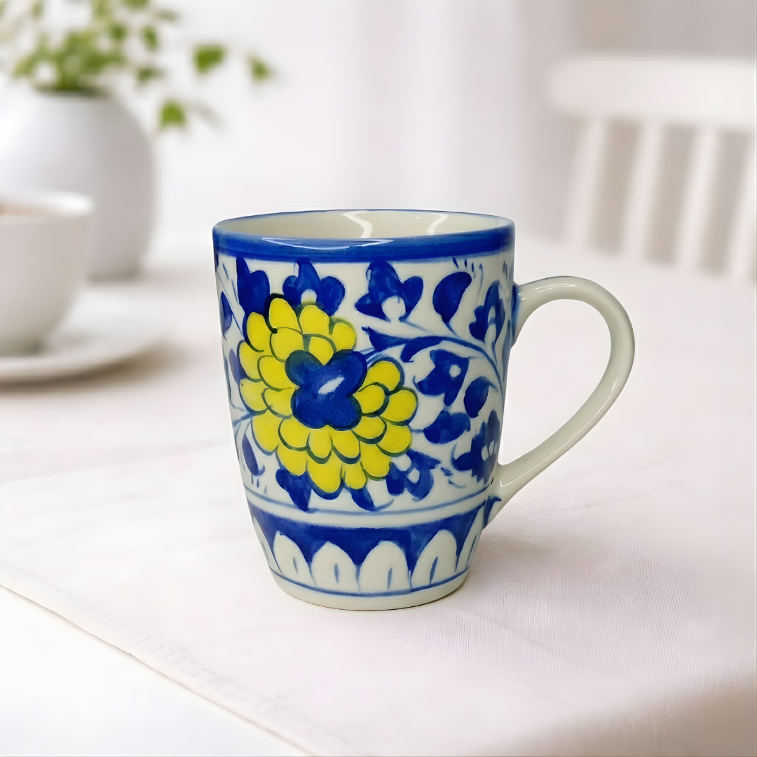 Bring a touch of artisan craftsmanship to your daily routine with this stunning handmade blue pottery mug. Featuring intricate blue and white floral and leaf designs, this ceramic piece is a beautiful blend of traditional artistry and modern function.